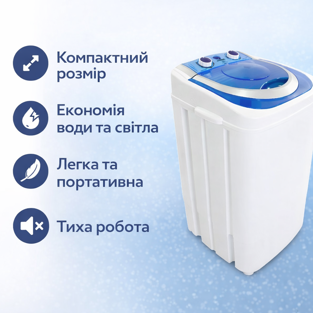 Брала цю машинку в село — дуже задоволена покупкою. Вона легка, компактна, її зручно переносити з місця на місце. Не займає багато простору, проста у використанні та добре підходить для щоденного прання. Для села чи дачі — чудовий варіант.